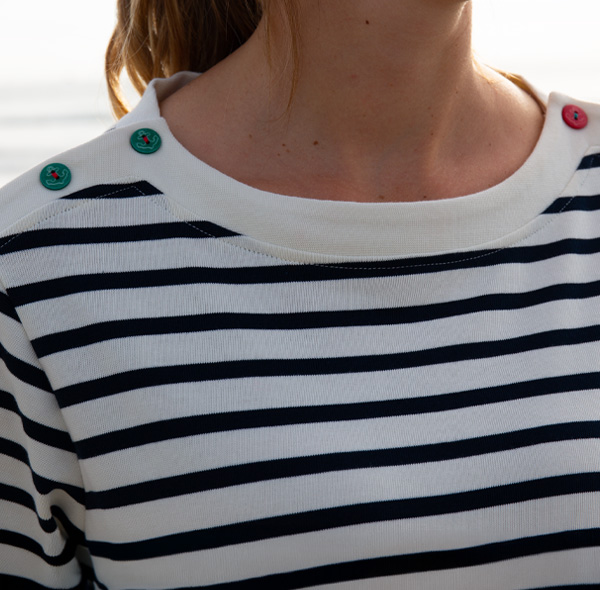The Madly women's sweatshirt reinvents casual wear with femininity and elegance. Its flattering boat neck and mismatched button closures on the shoulders are reminiscent of traditional Breton sailor tops, while its cotton jersey fabric offers unparalleled softness. With its timeless straight cut, this lightweight sweatshirt is a comfortable essential for the spring-summer season.