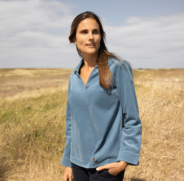 Craquez pour la coupe à la fois féminine et décontractée de cette blouse à col V ! Elle se démarque par son pli asymétrique à l'avant et ses revers à motifs aux poignets. Sa matière en velours à grosses côtes convient aussi bien à la mi-saison qu'à l'hiver. Profitez du froid avec douceur et élégance avec cette blouse en velours côtelé.