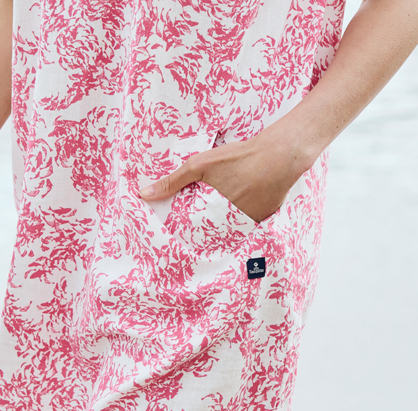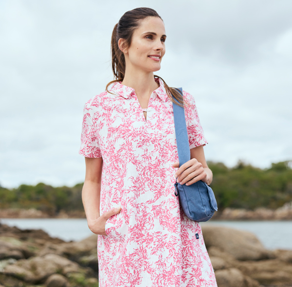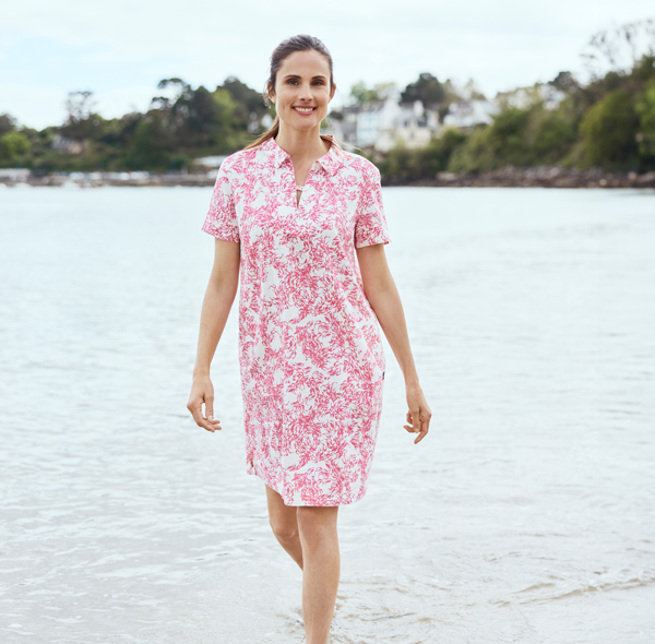 Enjoy a relaxed summer in this short-sleeved dress ! Its original prints are sure to express your love for the sea, and its breathable ramie fabric resembles linen. You'll love the flared silhouette and sailor collar of this summery design, which will flatter your figure.