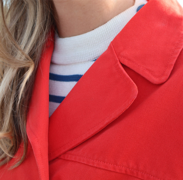 Fitted unlined water-repellent canvas pea coat for women.