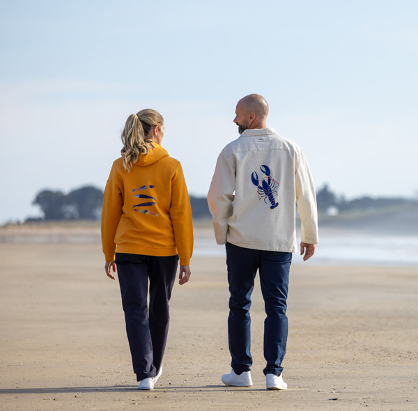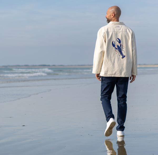 The Cachou unisex smock highlights Breton art with a blue lobster print designed by artist Stéphanie Veillard. This timeless cotton canvas smock, a traditional piece with a colorful Mousqueton spirit, is perfect for your coastal getaways, accompanying you from the harbor to the beach with style and character.