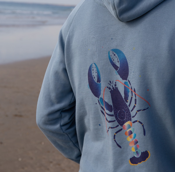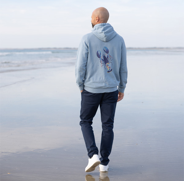 Men's zip-up hoodie with a lobster print on the back, designed by artist Stéphanie Veillard.