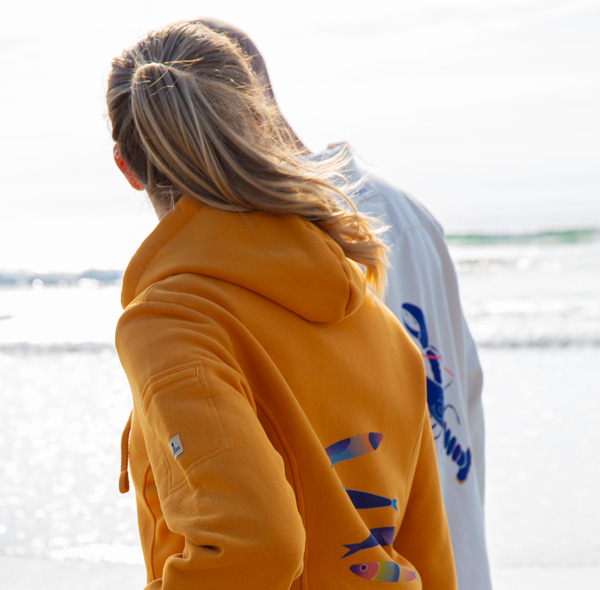 Discover the timeless TRAOU zip-up hoodie, an exclusive piece born from the collaboration between Mousqueton and the talented Breton artist Stéphanie Veillard. This women's cotton fleece sweatshirt is adorned with a vibrant summer print: a school of multicolored sardines! Perfect for coastal walks or relaxing moments, it combines comfort and casual style with its brushed interior and drawstring hood.