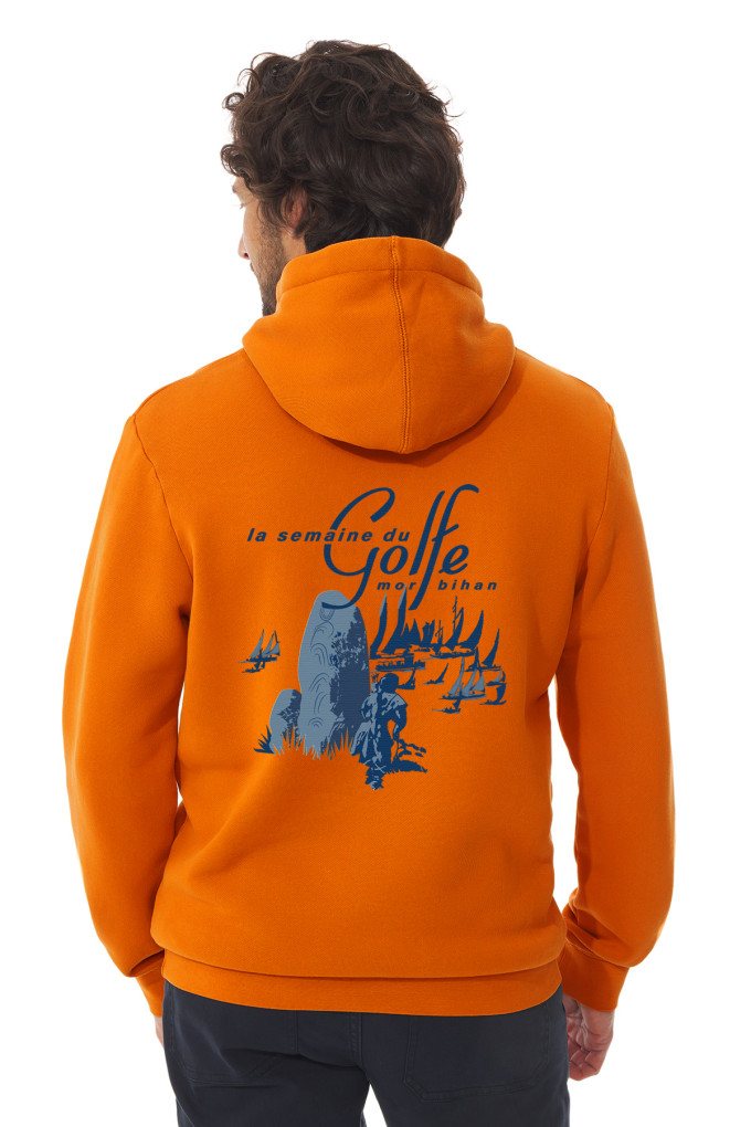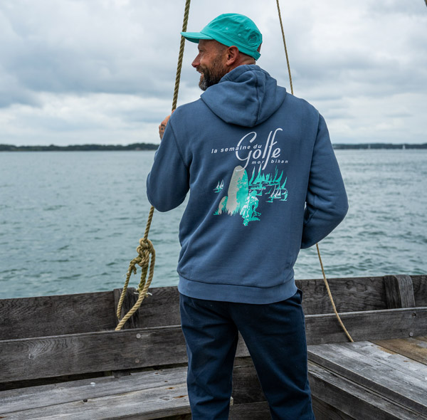 Profitez des festivités avec le sweat officiel de la Semaine du Golfe ! Pour chaque édition, l'artiste breton Gildas Flahault réalise une peinture pour l'évènement. Retrouvez-la sous forme de sérigraphie au dos de ce sweat à capuche.