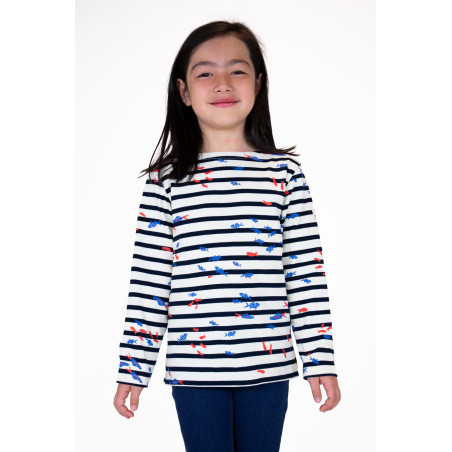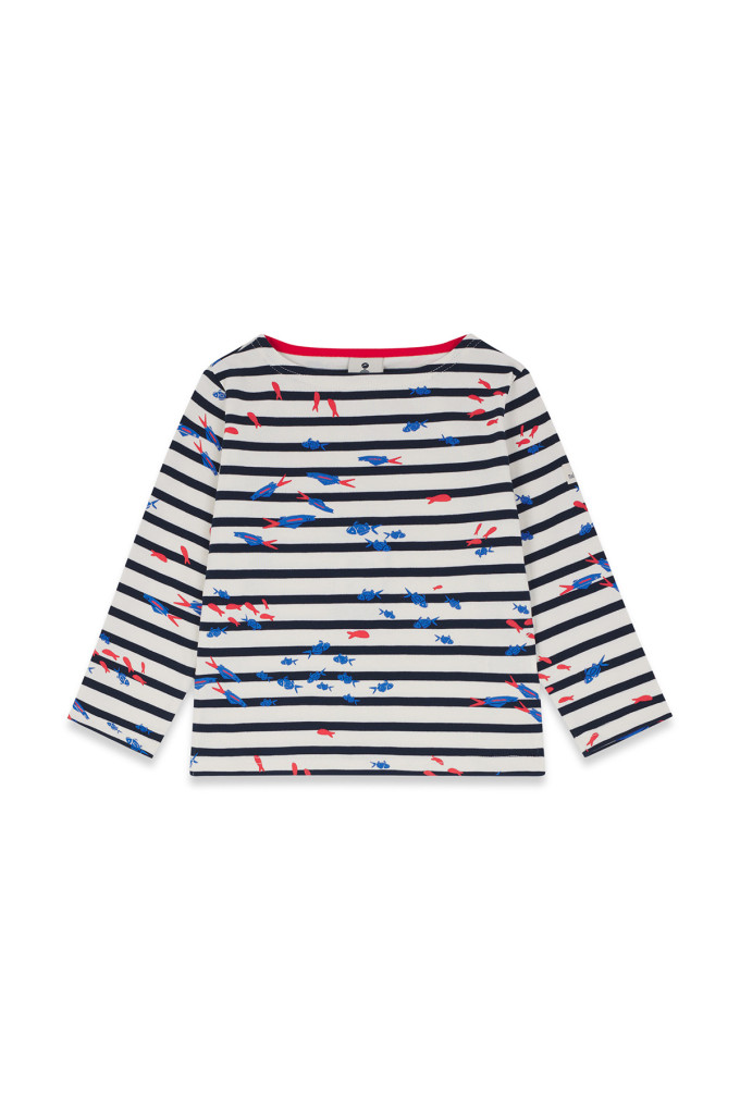 Voilà un monde marin coloré à retrouver sur cette marinière enfant en coton ! Habillez votre moussaillon avec cette marinière à motifs de bancs de poissons, une création unique réalisée avec l'artiste bretonne Morgane Chouin. À l'école comme à la plage, c'est le moment d'adopter un look iodé plein de fraîcheur.