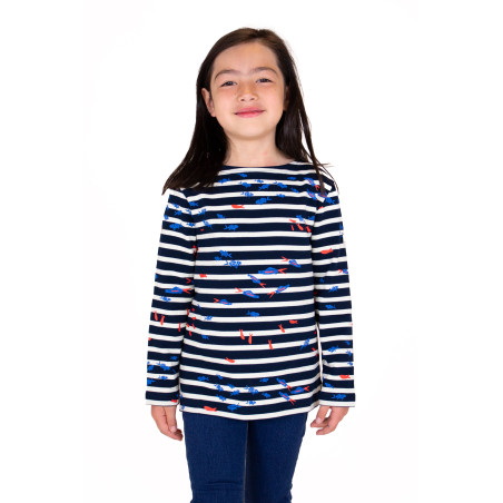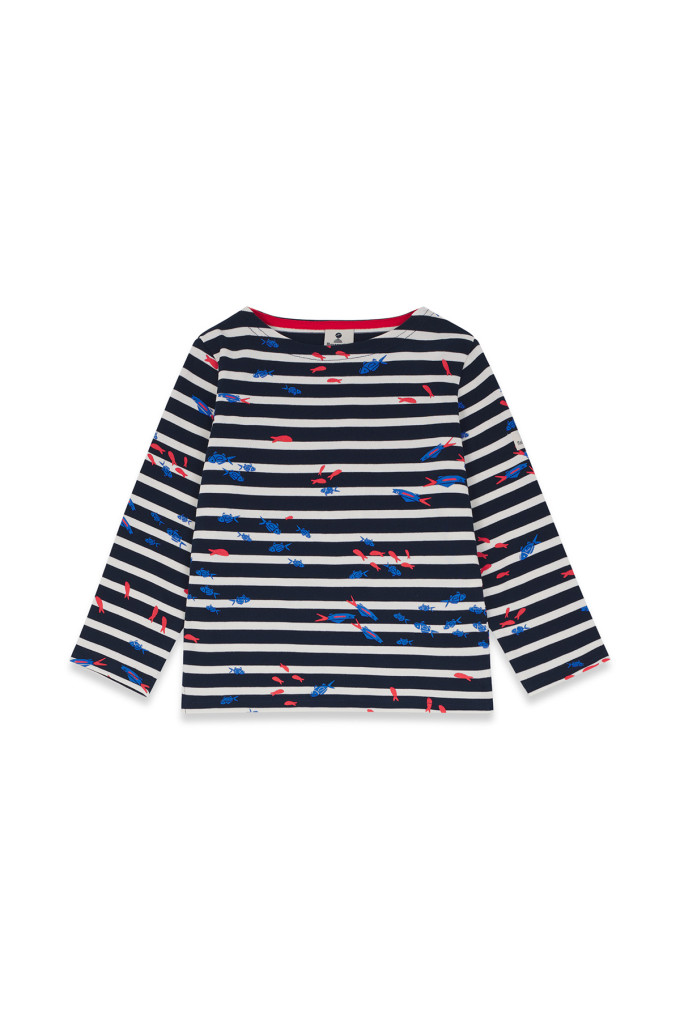 Voilà un monde marin coloré à retrouver sur cette marinière enfant en coton ! Habillez votre moussaillon avec cette marinière à motifs de bancs de poissons, une création unique réalisée avec l'artiste bretonne Morgane Chouin. À l'école comme à la plage, c'est le moment d'adopter un look iodé plein de fraîcheur.
