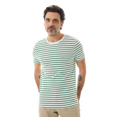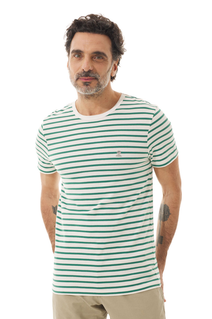 Découvrez ce t-shirt homme en jersey de coton biologique ! Sa coupe et ses manches ajustées donnent une allure tendance à vos looks. Petit plus, son col rond en côtes qui contraste avec les rayures colorées. Doux et respirant, on apprécie ce t-shirt rayé pour l'été, accompagné d'un short en toile.