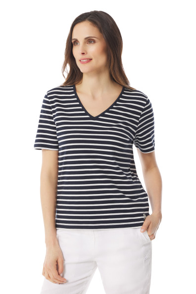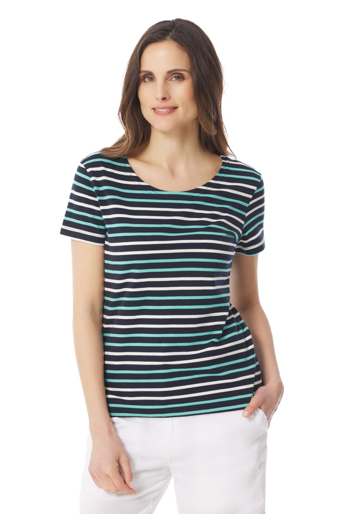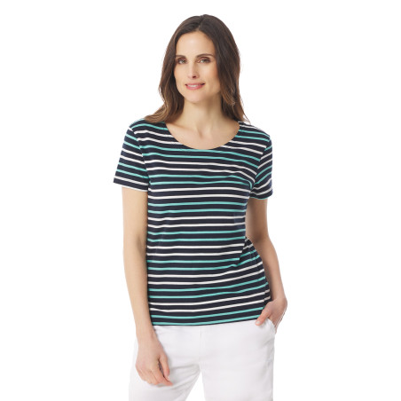 Optez pour la couleur avec ce t-shirt à manches courtes et ses rayures vitaminées ! Il est conçu dans un coton biologique léger et doux, qui convient aux températures d'été. Ce t-shirt rayé femme est facile à porter en toute occasion et donne du pep's à votre tenue. Pour souligner la silhouette, il est légèrement ajusté à la taille.
