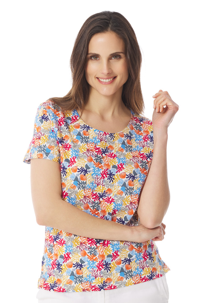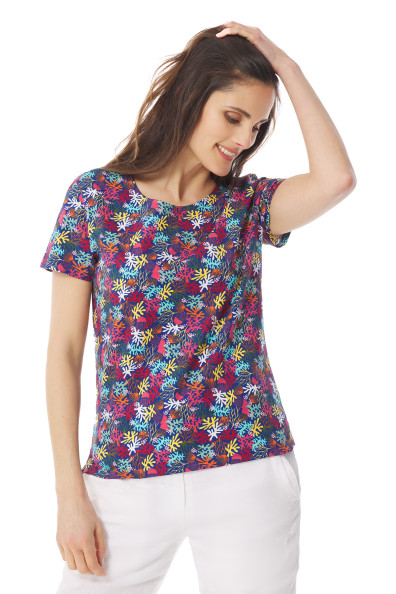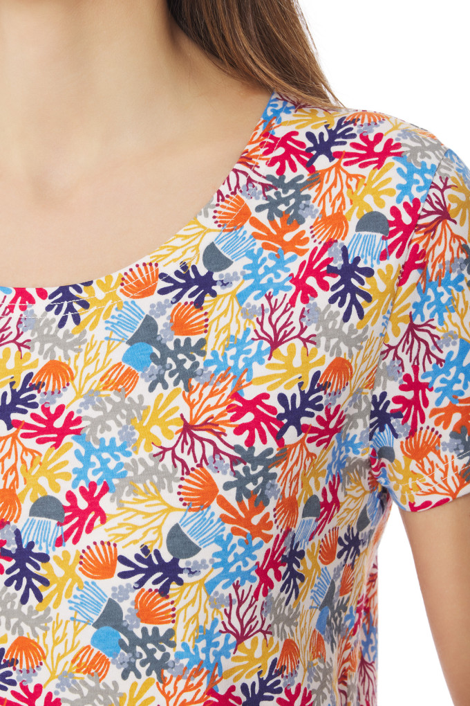 Découvrez notre t-shirt à manches courtes et ses imprimés colorés ! Alliant confort et style pour les beaux jours, il est conçu en coton biologique. Les motifs coraux de ce t-shirt imprimé femme apportent une touche marine à votre tenue. De quoi compléter votre vestiaire estival avec un modèle unique !