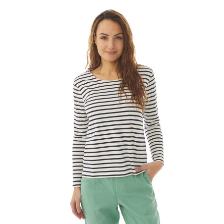 Affichez un look marin avec le t-shirt femme à manches longues ! Plus léger que la traditionnelle marinière, ce t-shirt rayé séduit par son encolure arrondie et sa coupe ajustée. Son coton bio léger vous enveloppe de douceur. Ses combinaisons de couleurs font de ce t-shirt manches longues un "must-have" de votre garde-robe.