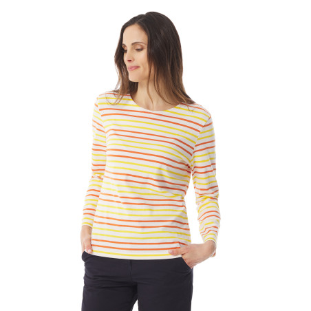Faites le plein d'énergie avec notre t-shirt femme à manches longues et ses rayures multicolores ! Tricoté en jersey de coton bio, il se veut doux et léger. Le petit plus de ce t-shirt, ce sont ses rayures qui mélangent teintes survitaminées et douces, à l'image d'une journée d'été. On apprécie son encolure arrondie, à mi-chemin entre col rond classique et encolure bateau de la marinière.
