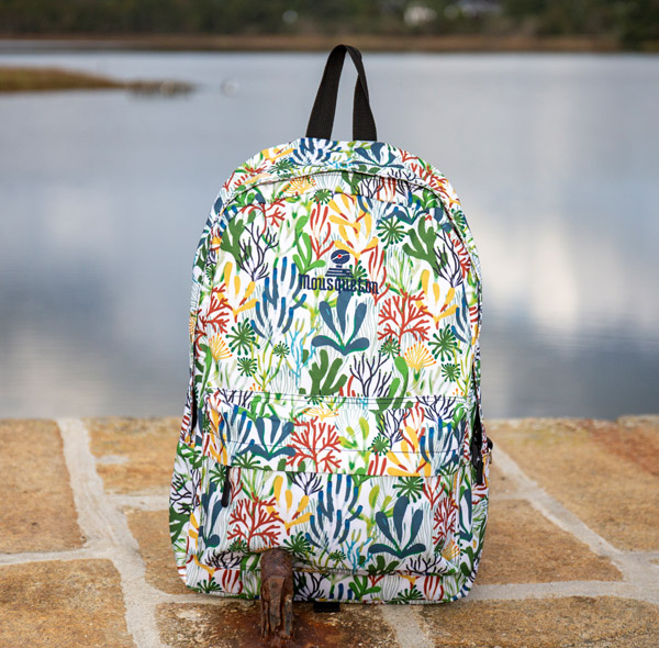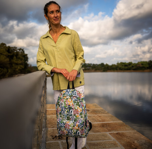 Le motif de ce sac à dos illustre la salicorne, une plante qui pousse près des littoraux en Bretagne. On l'utilise comme condiment du fait de son goût iodé et sa texture croquante.
