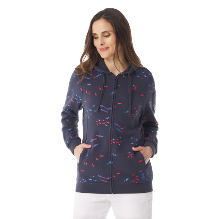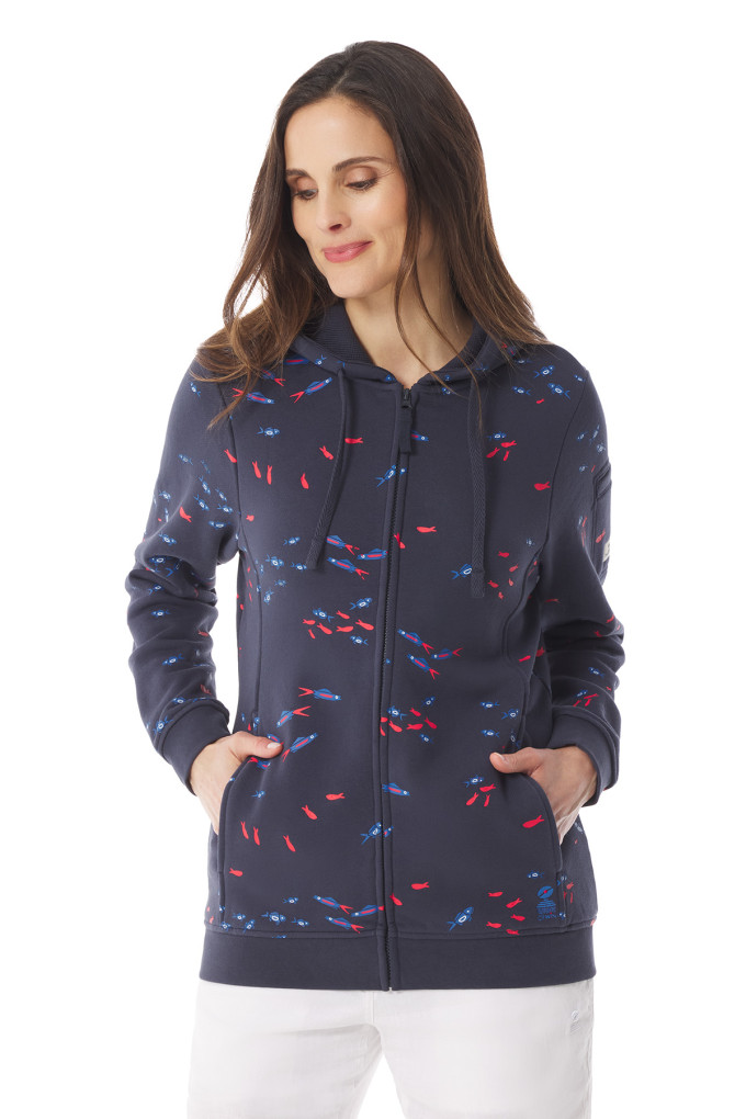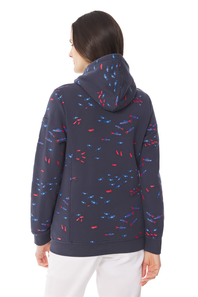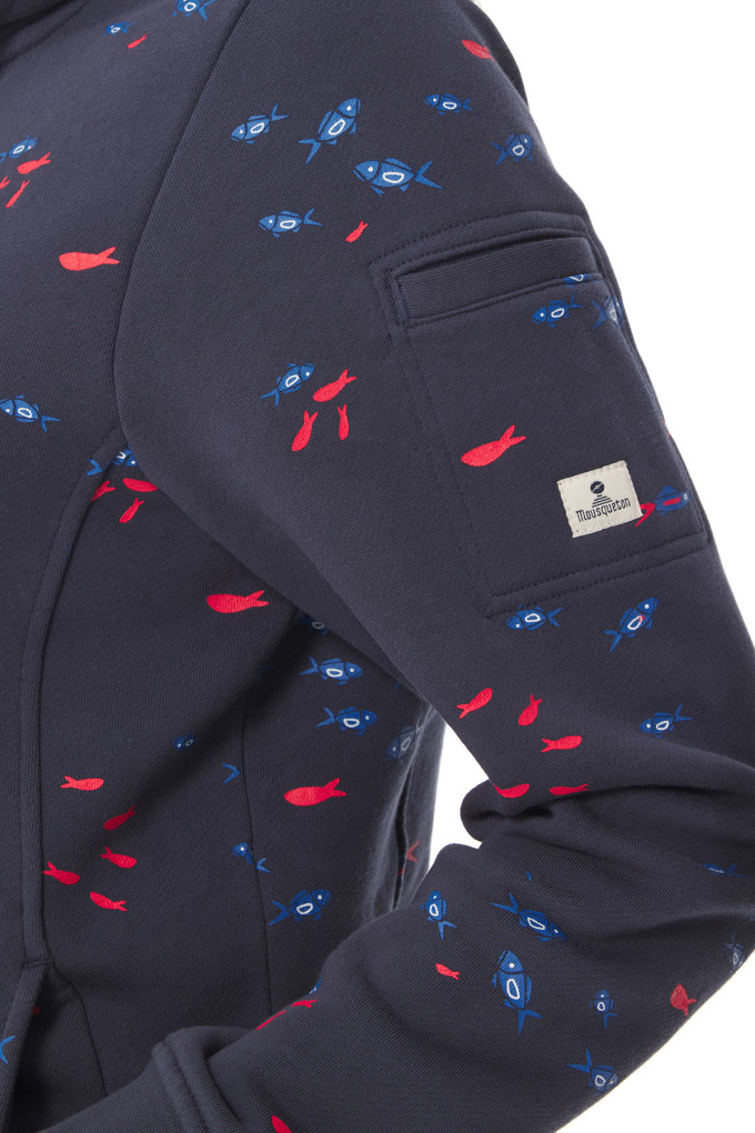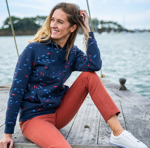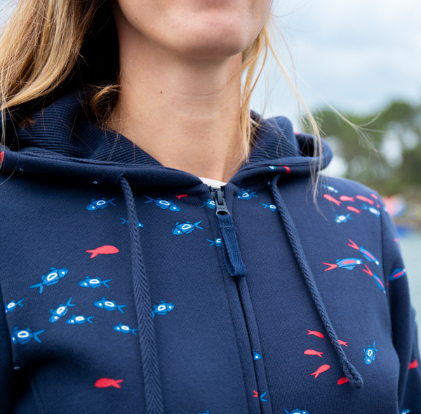 Le sweat à capuche femme se renouvelle pour vous offrir des motifs toujours plus uniques et marins ! Ici, les poissons nagent en bancs et apportent de la couleur à vos looks.