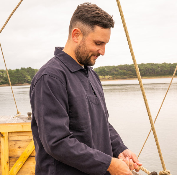 Maintenu par un bouton situé à l'intérieur, le col de cette vareuse bleu marine est la signature des métiers de la mer. Il a été autrefois conçu pour éviter que les cordages ne s'y accrochent lors de la remontée des filets. Aujourd'hui encore, ce col se retrouve sur notre vareuse pour rester fidèle à l’authenticité du vêtement. Facile à enfiler, vous ne voudrez plus jamais l’enlever !