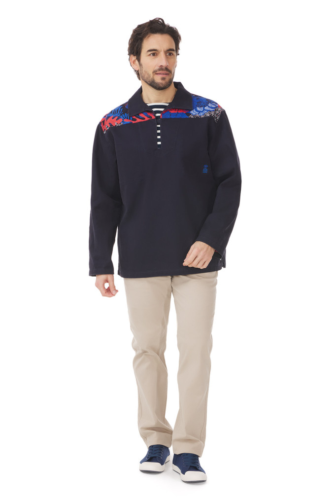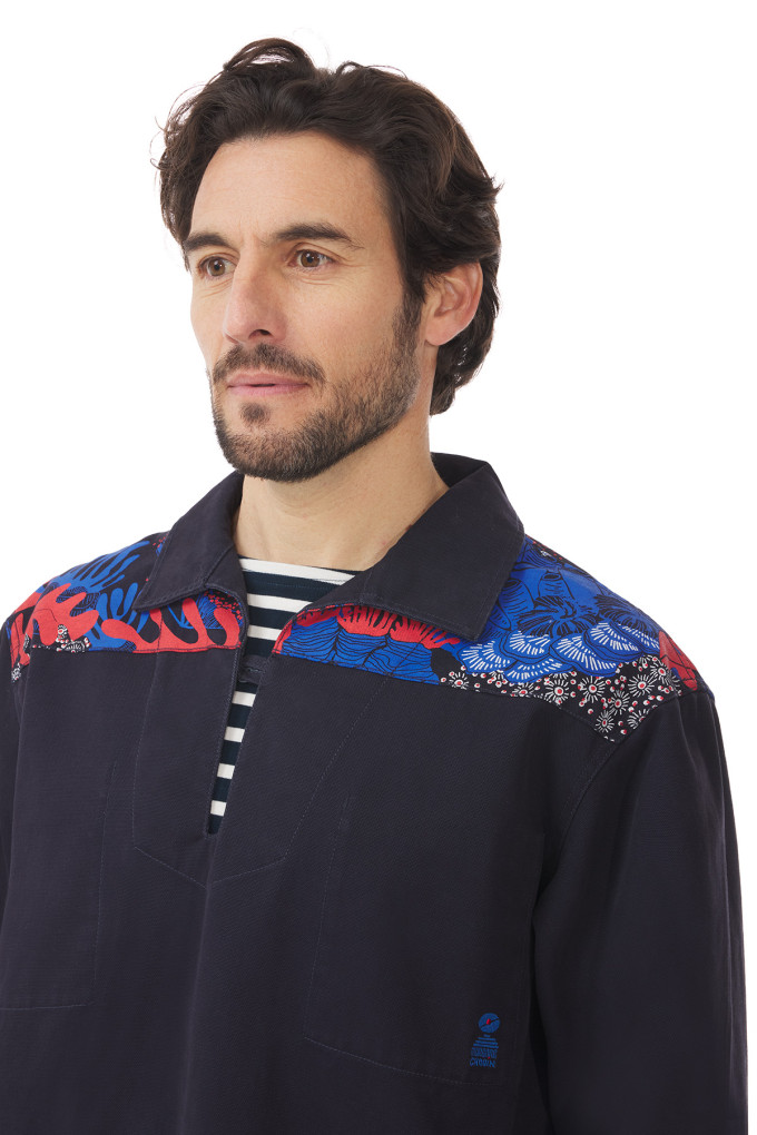Explorez les fonds marins avec cette vareuse à motifs ! Réalisés grâce à la technique de linogravure par l'artiste bretonne Morgane Chouin, ces imprimés décorent joliment la partie haute de cette vareuse. Solide et coupe-vent, pratique, c'est une pièce iconique du vestiaire marin revisitée dans cette collaboration 100% iodée.