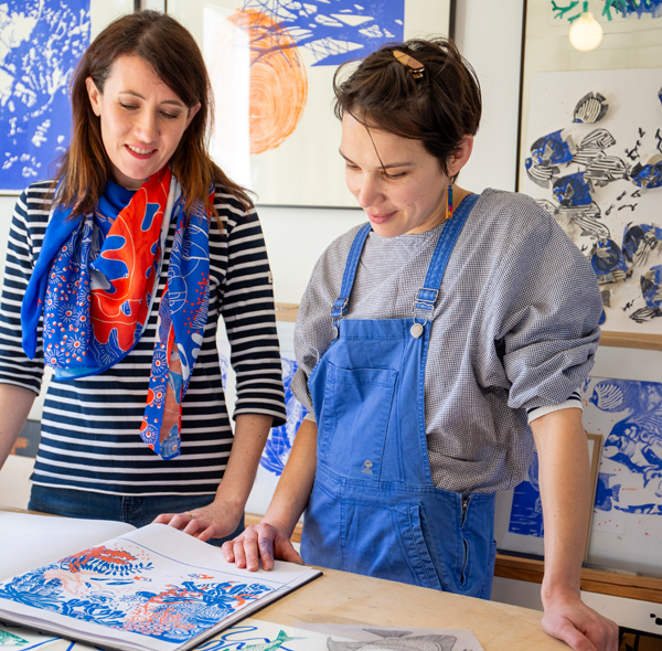 Pour cette collection capsule, notre équipe de style collabore avec l'artiste bretonne Morgane Chouin, spécialisée dans la linogravure. Ses créations pleines de vie s'associent à l'univers joyeux et coloré de Mousqueton.