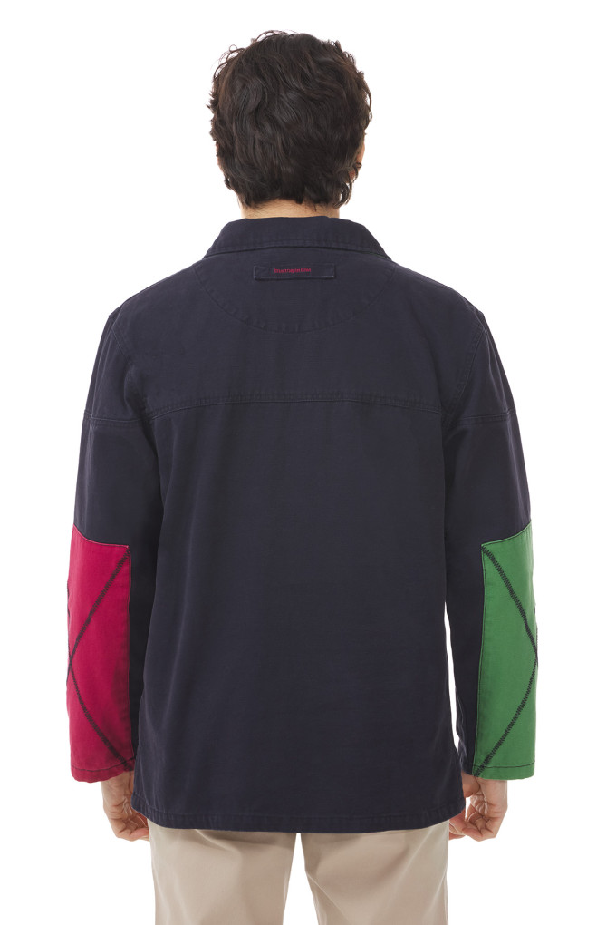 Vareuse bicolore à col boutonné et coudières de couleur différente.