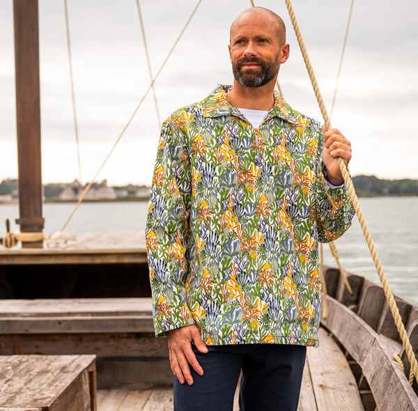 Sur cette vareuse à motifs, on retrouve les éléments de la vareuse traditionnellement portée par les pêcheurs bretons : toile de coton solide, col boutonné, et poches intérieures à la poitrine.
